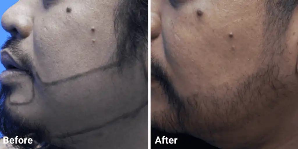 The hair grafts are extracted from the donor region which is usually the back of the scalp, and are transplanted to the patchy bald portion of the moustache or beard.