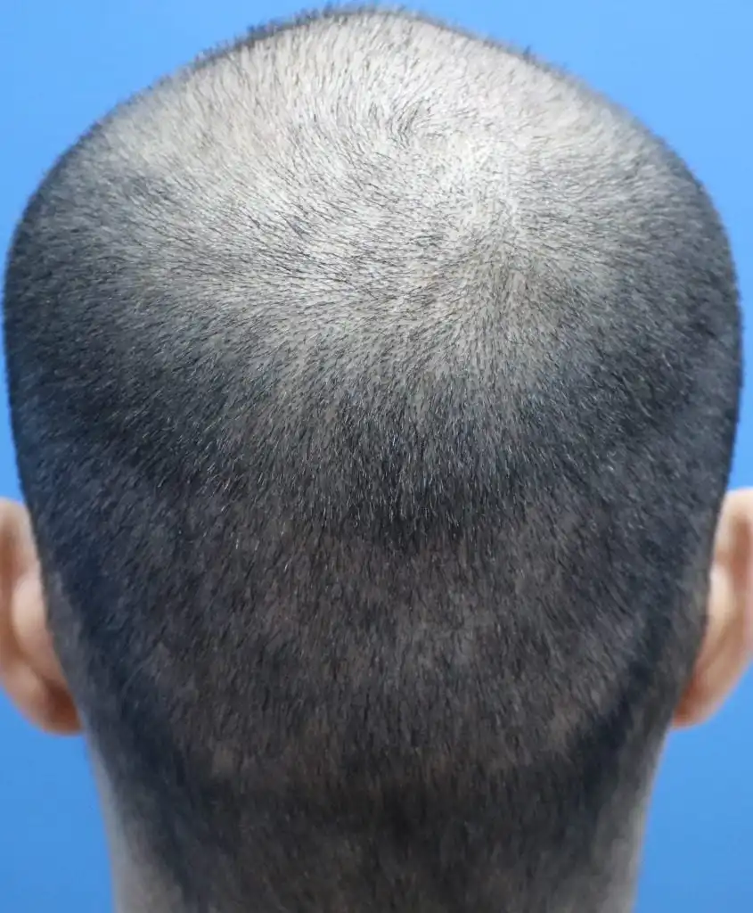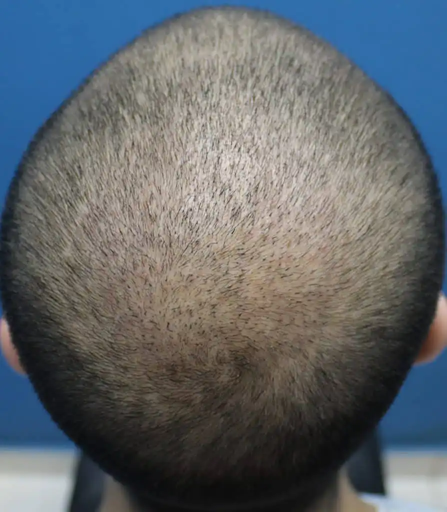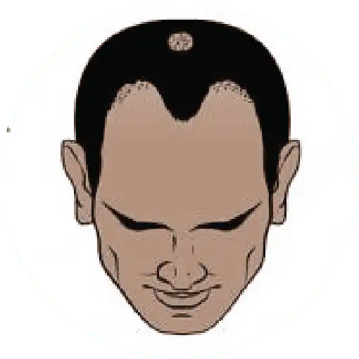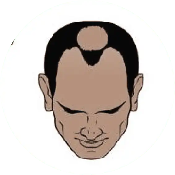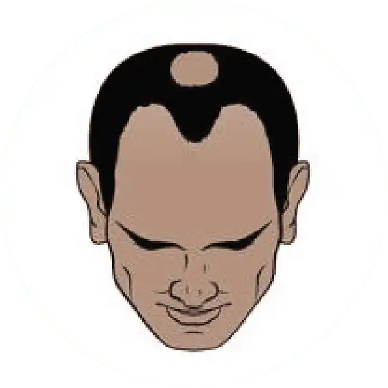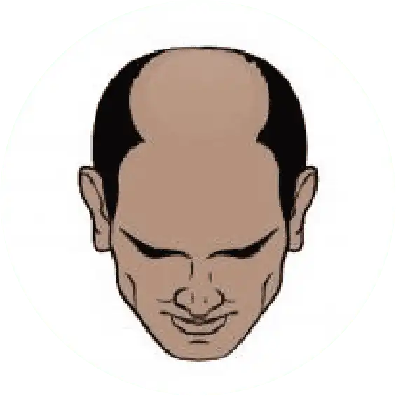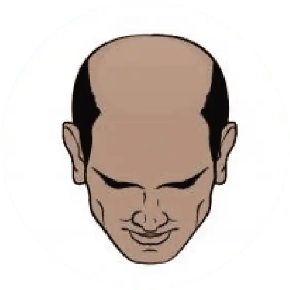 The most severe stage of hair loss, only a band of hair going around the sides of the head remains. This hair is usually not dense and may be fine.