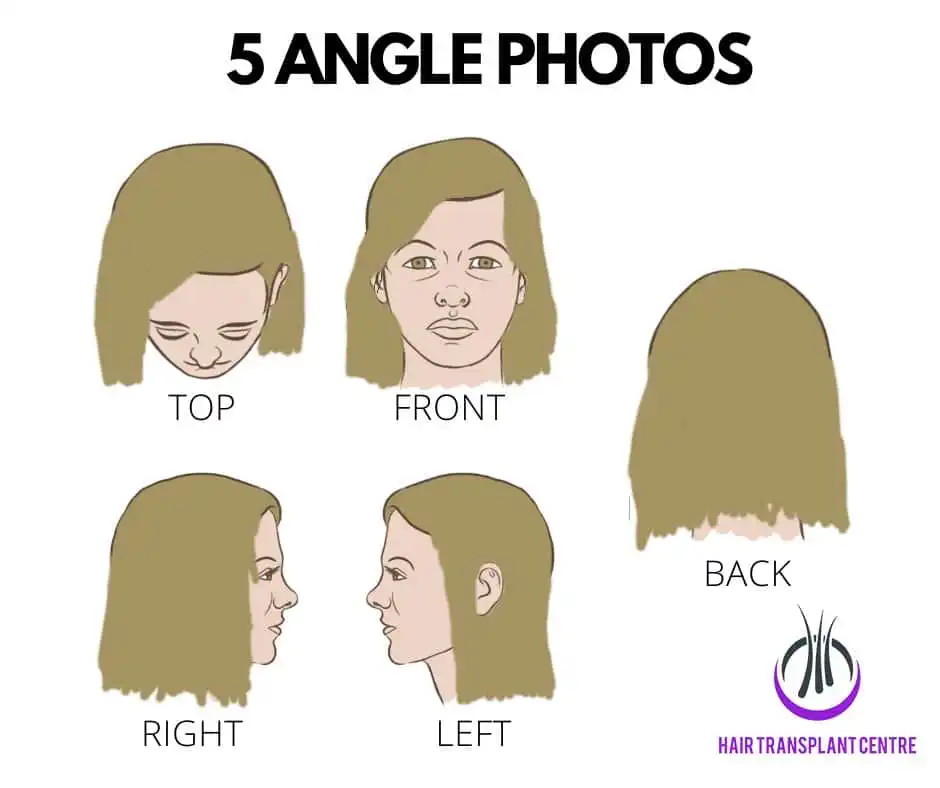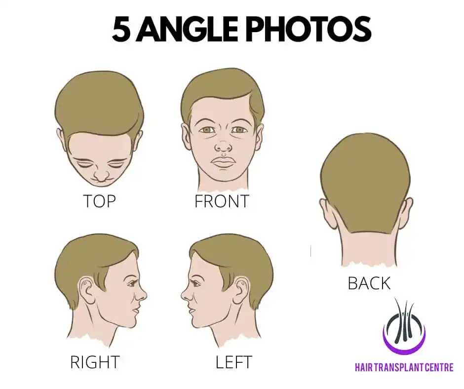 Every consultation for hair transplant starts with the process to determine your hair loss stage. Below are the five different types of pictures showing the different angles of your hair for both male and female. This is called 5 Angle Photos.