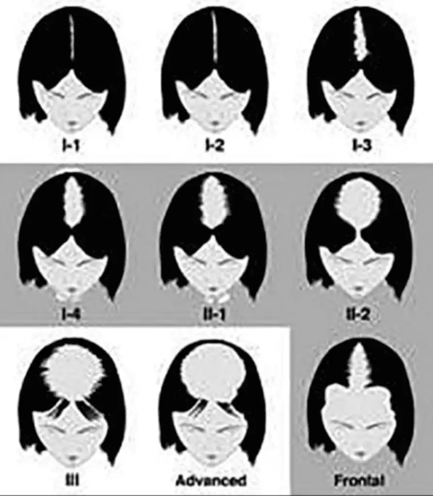 At this stage,There is a slight hair loss and recession of the hairline around the temples. This is also known as an adult or mature hairline.